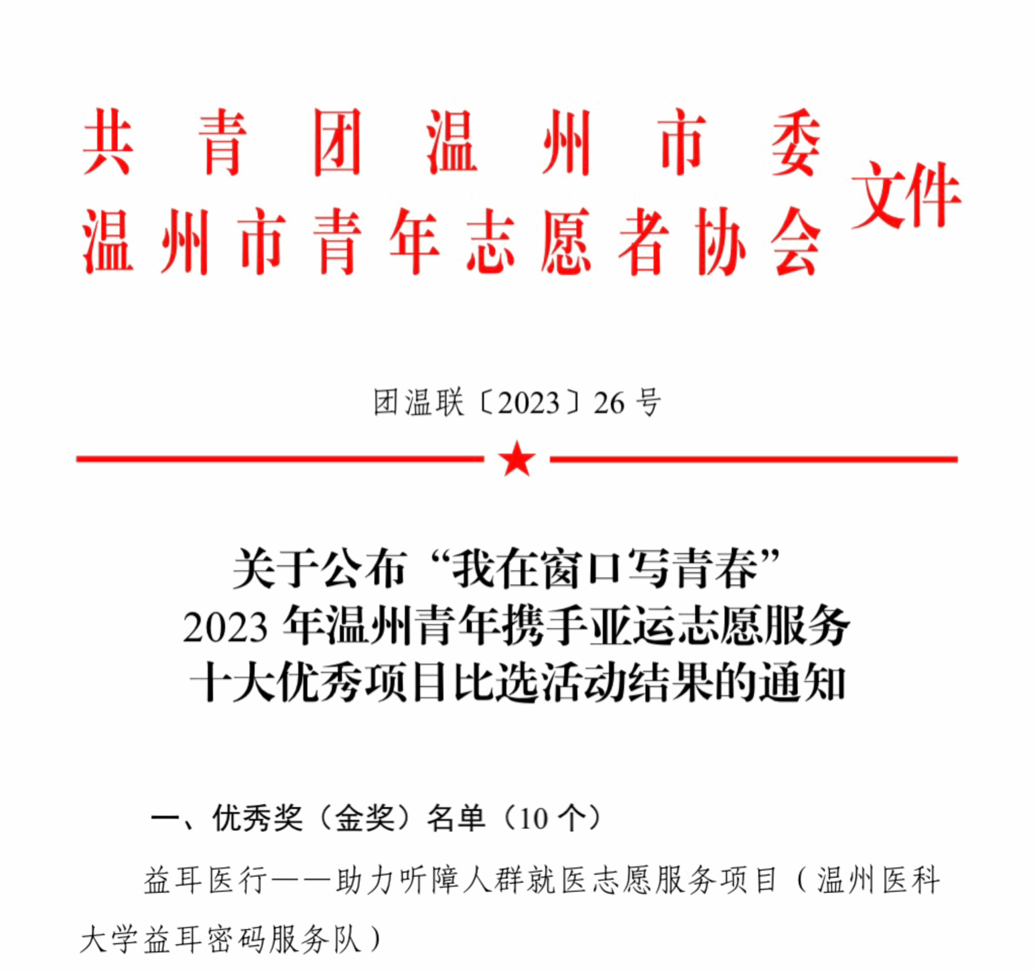 益耳密码志愿服务队,发挥校内本硕博青年学生及学校学科优势、医疗资源充足等特色,围绕听障人群及其家属和听力障碍潜在人群,开展就医全过程就诊陪诊、多途径宣传益耳知识等活动,致力于提高民众的听力保护意识和全民用耳大健康的能力,目前已获听障人群、医院、政府等多方认可。项目实施至今受益人数超20万,科研成果获国家级省级荣誉10余项,并且得到学习强国、光明日报、浙江教育报、中国大学生网等媒体报道,取得了良好的社会反响。