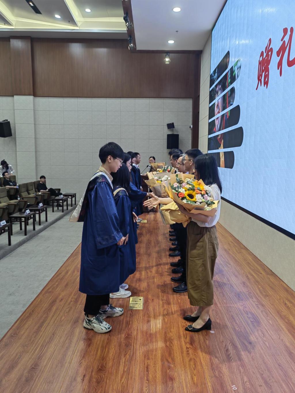 毕业分别之际,毕业生与导师代表互赠礼物表达情意。导师们一一上台为毕业生们送上学院精心准备的专属礼物。受礼后,优秀毕业生代表为导师们献上鲜花并鞠躬致谢。