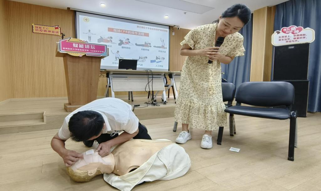 “夏天是人们喜欢运动的季节,遇到有人游泳溺水了,有人跑步突然倒下了,怎么办?如何抓住医生到来之前的黄金急救4分钟,挽救患者生命……”团队指导老师、浙江省红十字会二级救护讲师吴东方在赋能课堂上抛出学急救必要性的问题。随后吴东方老师通过讲解和实操演练相结合的形式教授居民心肺复苏(CPR)的操作以及自动体外除颤仪(AED)的使用方法等应急救护理论知识,利用“模拟人”演示动作要点。居民们在老师的耐心指导下进行了心肺复苏的练习,纷纷表示今天的赋能培训很有用,希望自己有能力在关键时刻去救人。