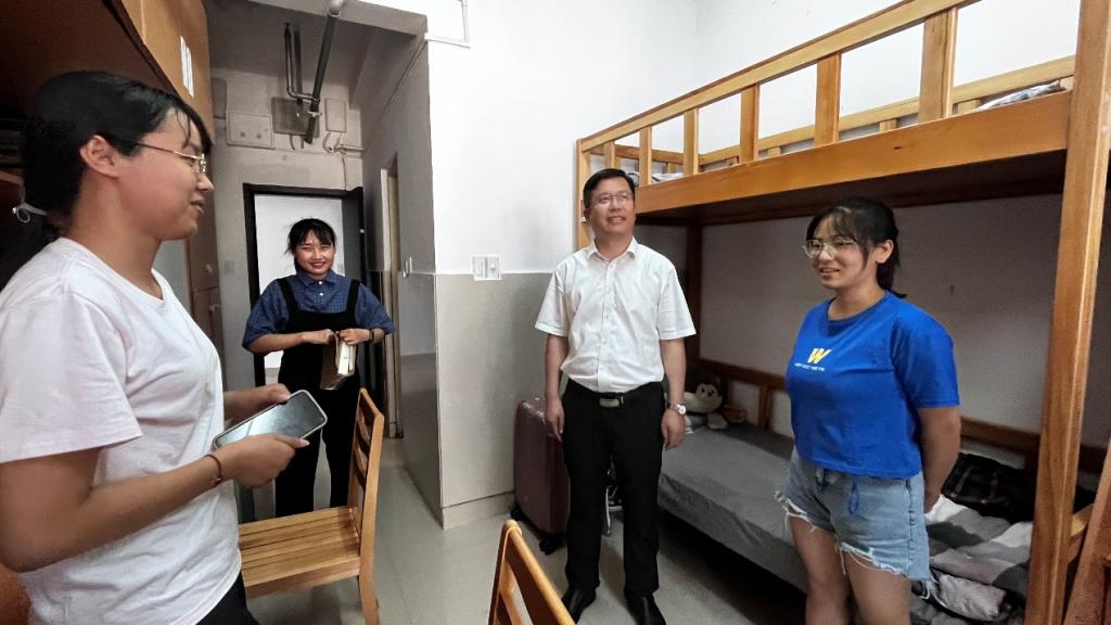 当天下午,学院党委书记管素叶,执行院长郑晓群、党委副书记陈贤新、副院长楼哲丰、副院长关万春等领导分别走访新生寝室,亲切询问新生的报到行程、兴趣特长、家乡风土等,为新生讲解初到校园的安全问题和相关事项,提醒新生注意人生安全和卫生防护,鼓励新生尽快适应大学生活,在新的起点再出发。新生们也积极主动的与老师们进行互动,诉说自己对新阶段的畅想与愿景。