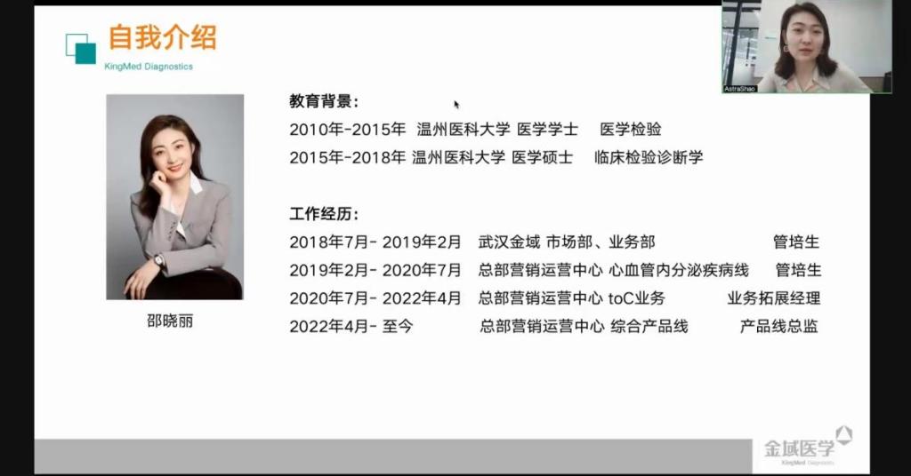 医学检验专业2015届本科生,临床检验诊断学2018届硕士研究生,毕业后作为管理培训生进入金域医学集团,曾在北京、武汉等分公司担任业务拓展经理等职务,2022年在广州金域医学总部营销运营中心临床医学部任职综合产品线总监。