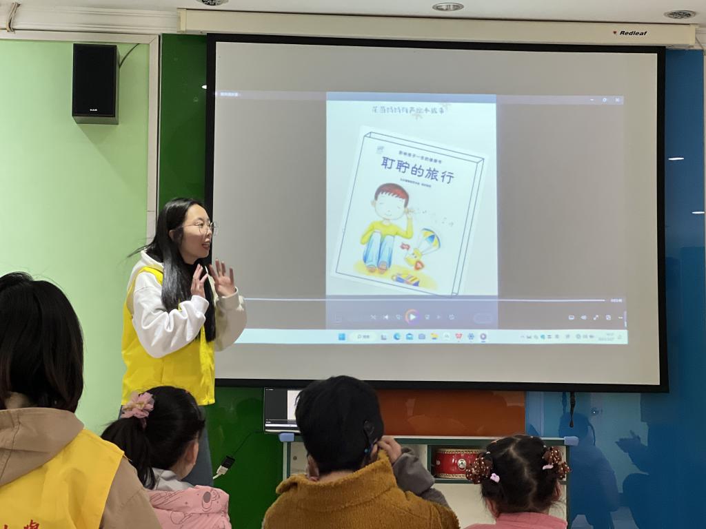 “耵聍的旅行”绘本学习。活动开始,志愿者用绘本导入,为小朋友们介绍了耵聍是怎么产生的以及对保护耳朵的用处。两位志愿者的讲解生动活泼,结合手语的示范,将原本枯燥的科普变得富有童趣,达到了“寓教于乐”的效果。