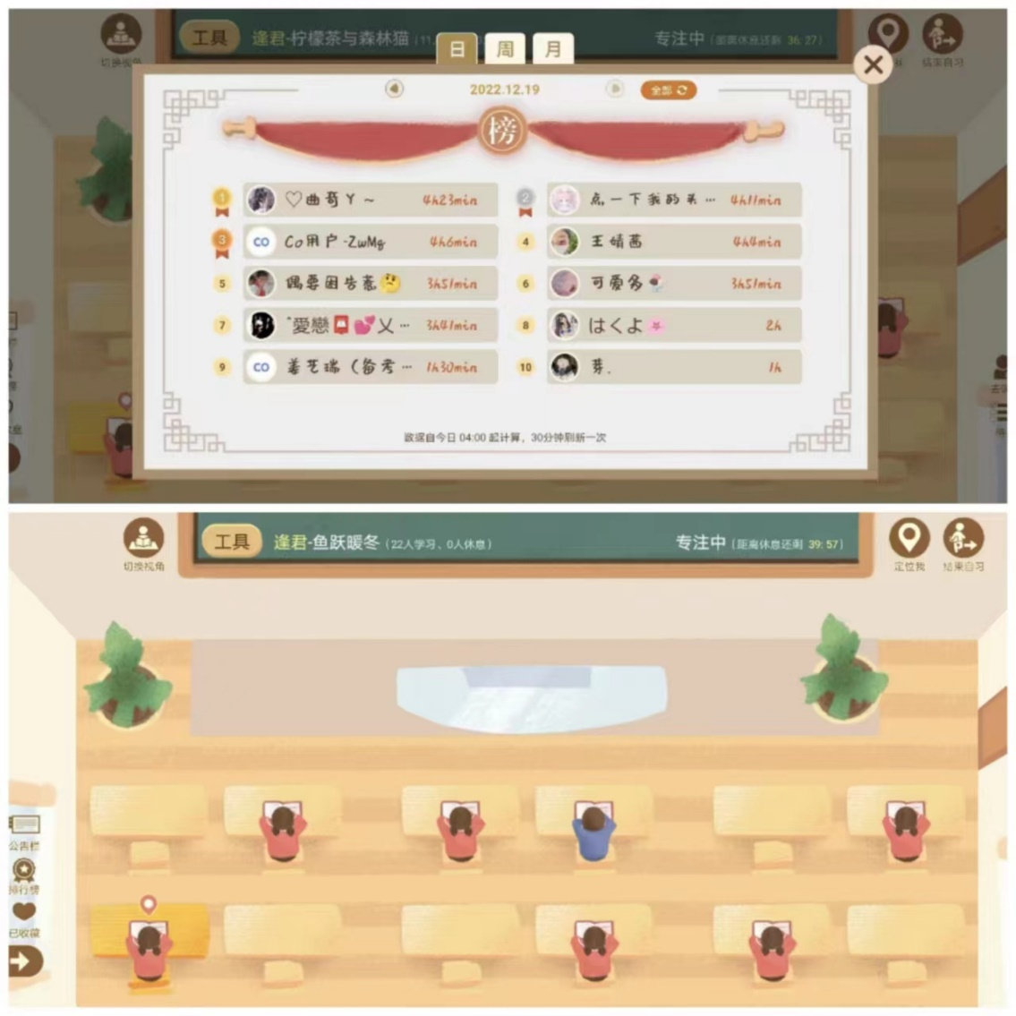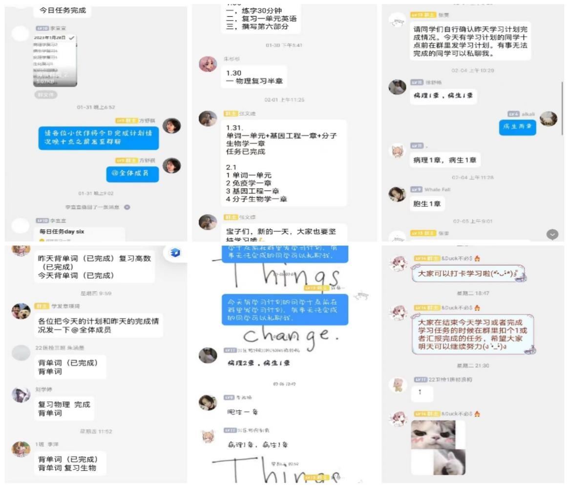 “鱼跃”暖冬计划分为“鱼跃”自习室和“鱼跃”学习小组两大项目,前者通过线上app搭建自习室,为同学们提供自主学习平台,由党支部成员作为志愿者统计后台自习时长,每日准时给予学生暖心鼓励,一起学习,互相打气;后者将同学们分成若干小组,由党支部成员作为组长,在组长牵头带领下于线上平台分享每日学习任务,在互相监督中共同进步,并针对各学科问题开展组内交流探讨。共有150余人参与“鱼跃暖冬”计划,其中96.7%的同学在学期初考试中通过全部课程。